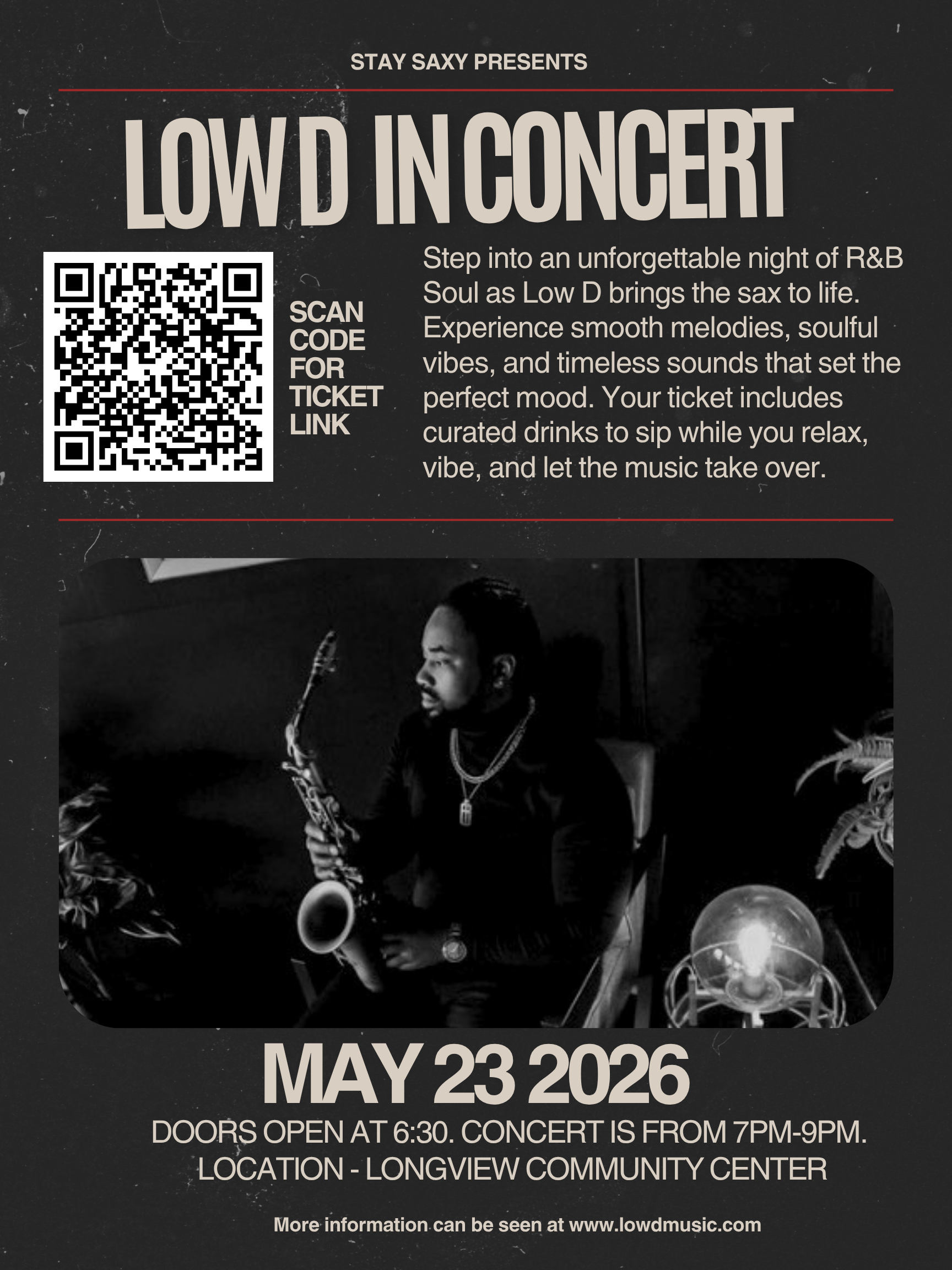 Step into an unforgettable night of R&B Soul as Low D brings the sax to life. Experience smooth melodies, soulful vibes, and timeless sounds that set the perfect mood. Your ticket includes curated drinks to sip while you relax, vibe, and let the music take over.